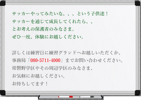 サッカーやってみたいな、、という子供達! サッカーを通じて成長してくれたら、、とお考えの保護者の皆様。 ぜひ一度、体験にお越しください。 詳しくは練習日にグランドへお越しいただくか、 事務局携帯「080-5711-4000」までお問い合わせください。 常磐野学区やその周辺学区のみなさま、お気軽にお越しください。 お待ちしてます!